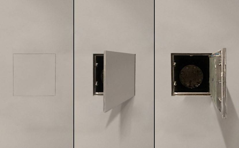Скрытый ревизионный люк такого типа функционирует по принципу шкафа-купе. Дверца отводится вперед, а потом в одну из сторон, в зависимости от выставленной конфигурации и купленной модели.