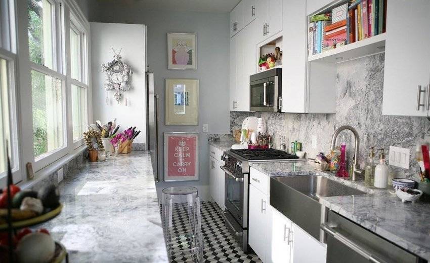 Фартук обязательно проходит по всему периметру кухонного гарнитура, а не только за варочной панелью и мойкой. Во-первых, это симпатичнее. А во-вторых, в этих местах всегда есть опасность запачкаться или запачкаться брызгами жира. А если нет материала, который легко чистится, вся красота кухни поблекнет в лучшем случае за год. В случае, если раковина находится в углу, раздвиньте фартук до соседней стены, эта зона всегда самая грязная.