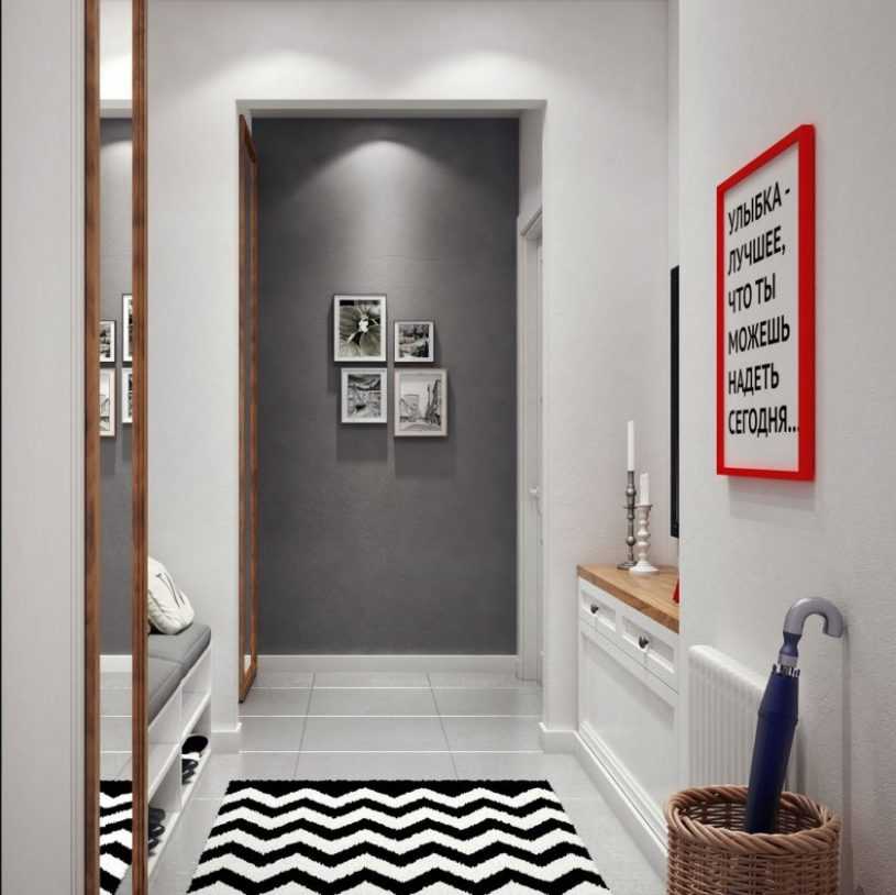 В небольшом коридоре отлично смотрится пуфик в сочетании с ковролином. В комнате можно разместить комод или полки. Отдельно следует предусмотреть отсек для хранения обуви. На стены можно повесить различные аксессуары, картины или фотографии. Они создадут домашнюю и уютную атмосферу.