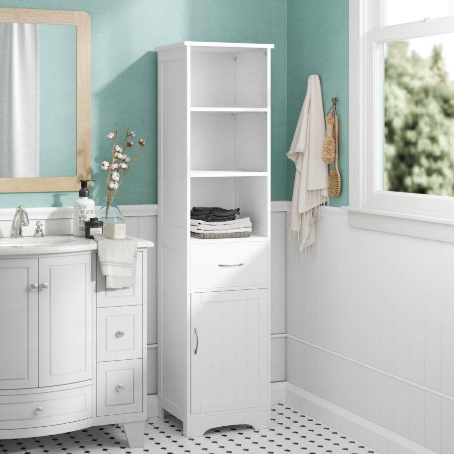 Ещё один популярный и вместительный вариант — шкаф-пенал. В ванной комнате он решит проблему хранения на 80% — забирая на себя большую часть косметики, полотенец и необходимых аксессуаров.