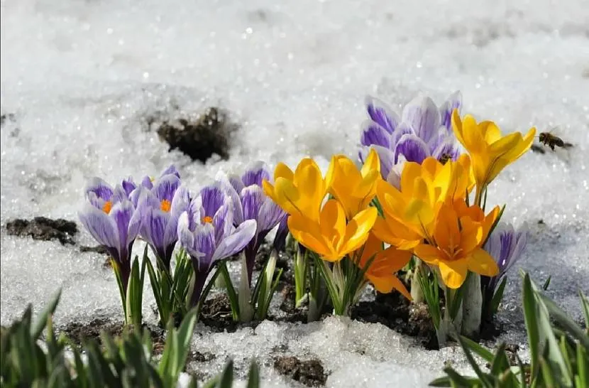 Они раскрываются в то же время, что и подснежники. Бутоны имеют кремовый, желтый, синий и фиолетовый цвет. Цветение начинается в марте. О посадке крокусов читайте в отдельной статье.