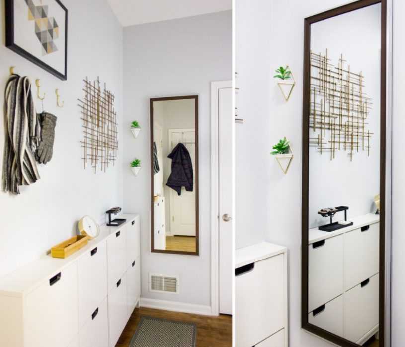 А размещение мебели вдоль двух противоположных стен малогабаритной прихожей совсем неправильно. В таком случае пользоваться коридором будет неудобно, ведь придется лавировать между шкафчиками и тумбами, то и дело, натыкаясь на углы. Если же кажется, что вторая стена пустует, на ней можно повесить зеркало, монтировать узенькие настенные полки с элементами декора или какими-то красивыми мелочами.