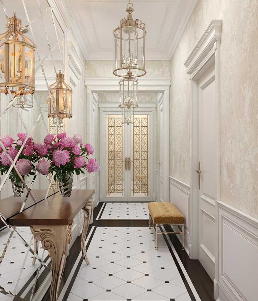 Классические прихожие в коридор выглядят респектабельно и элегантно. Мебель в классическом стиле выдержана в традициях прошлого. Ее линии чисты и изящны. Обязательно используется декор: фигурное обрамление дверных филенок, карнизы, элементы резьбы и т. п. Самые популярные цвета — белый (при этом резной декор может быть позолочен) либо цвет темного дерева. Фигурные мебельные ручки и крючки для одежды непременно должны быть «под старину». Для мягких элементов используется стеганая кожа или дорогой гобеленовый текстиль.