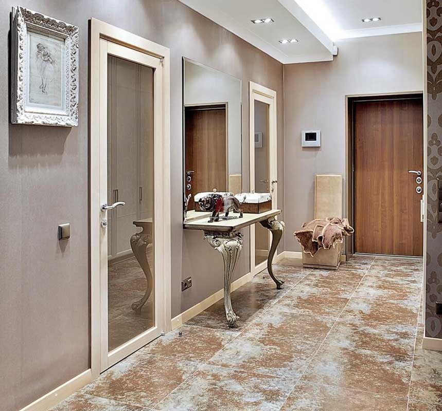 Первым делом важно правильно подобрать отделочные материалы с учетом того, что прихожая подвергается наибольшему загрязнению, особенно в сезоны дождей и слякоти. Подойдут гладкие, водостойкие и неприхотливые в уходе поверхности