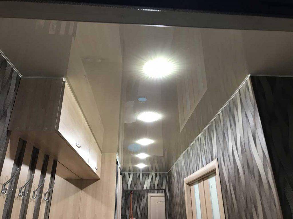 Лучшее место для светильников — это участки над дверьми. Здесь устанавливают точечные светильники или поворотные фары. Бокового освещения хватит. Как вариант, допускается натянуть диодную ленту по периметру натяжного потолка.