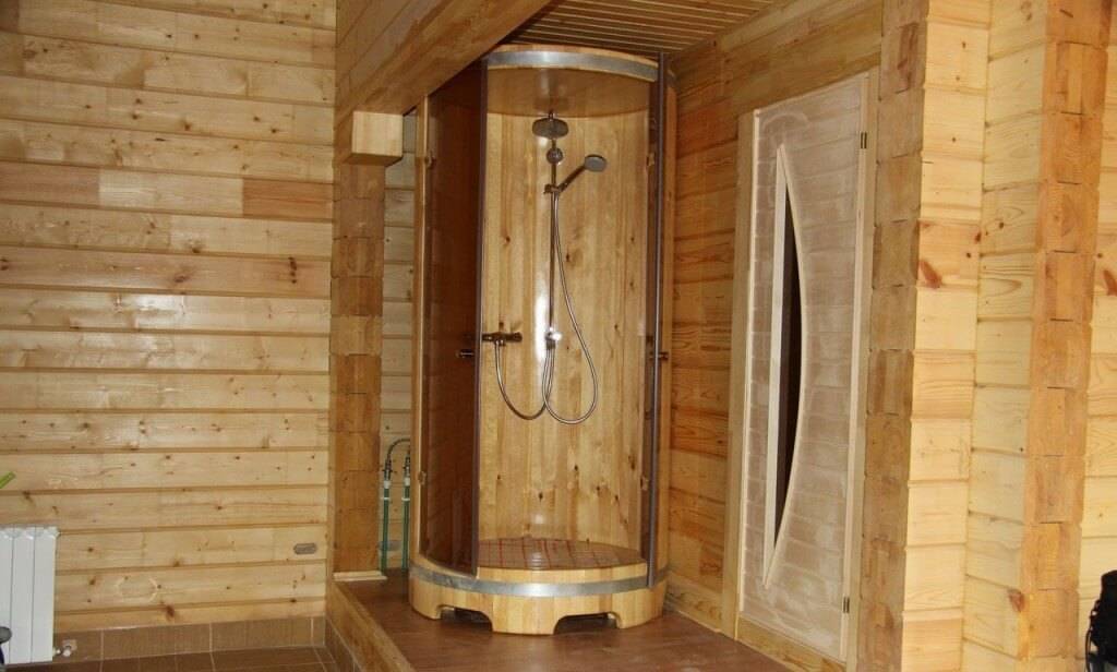 В моечном отделение бани необязательно будет находиться душ. Можно подвесить несколько ушат для обкатки холодной водой. Но в таком случае необходимо оборудовать отдельное место под размещение тазиков для мытья.