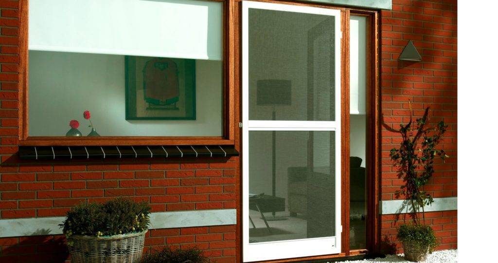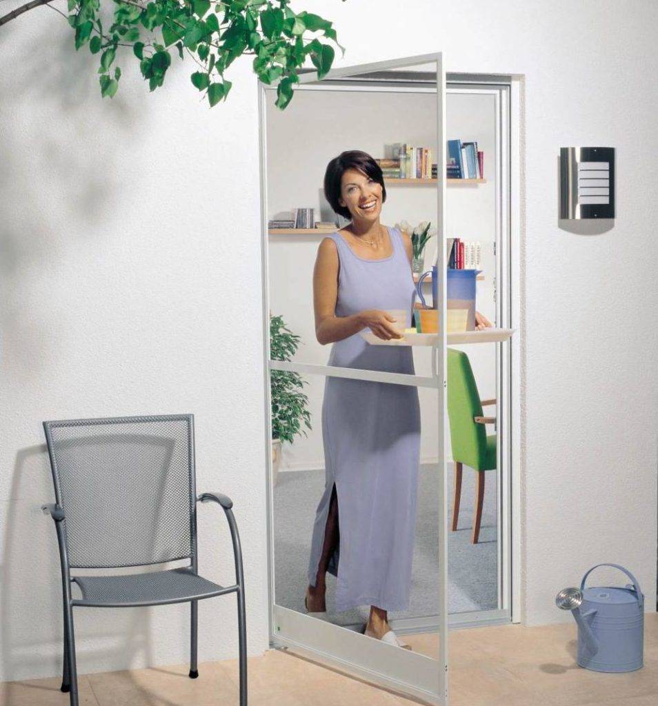 Распашные москитные сетки. Они дублируют входную дверь и крепятся на легких петлях. Подобные конструкции недороги в закупке и просты в установке, однако плохо защищают дом от москитов.