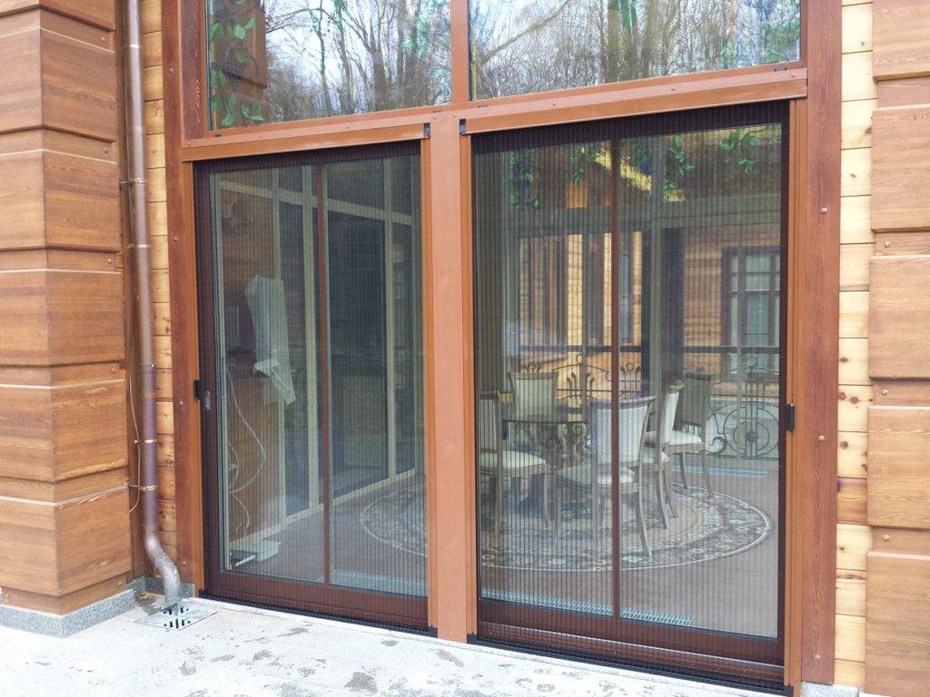 Дверь с москитной сеткой раздвижного типа работает по принципу шкафа-купе. Полотно при этом натянуто на алюминиевый каркас, в нижней части которого имеются ролики, а в верхней — ползунки, для уплотнения механизма используют щеточный уплотнитель.