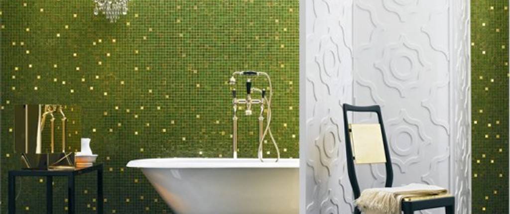 Стекло. Данный материал изготавливается в основном из венецианского сырья. Получаемые изделия характеризуются длительным сроком службы, водостойкостью, способностью выдерживать высокую нагрузку, а также хорошо противостоять различным грибкам, плесени и другим микроорганизмам. Стеклянная мозаика в ванную подходит благодаря своей внешней эстетике, к тому же она имеет обширное разнообразие в цвете, фактуре и может быть выполнена в металлизированном и зеркальном стиле.