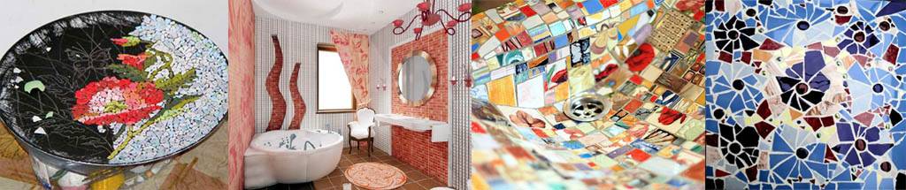 Здесь на рис. примеры самодельных мозаик. Первая слева – скорлуповая столешница. Сюжет не на гурмана, но для журнального столика в будуаре в самый раз.