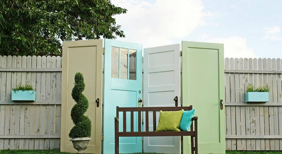Сделать ширмы можно практически из любых материалов, например из старых дверей. Особенно эффектно смотрятся в них зеркальные полотна, которые визуально расширяют границы участка. Ширмы необязательно должны повторять линию забора — их поворот можно выбрать так, чтобы добиться качественного солнечного освещения в отгороженной зоне, но при этом скрыть свой участок от глаз соседей.