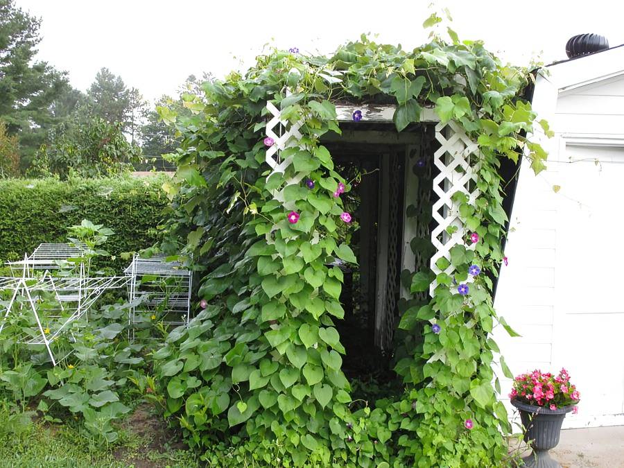 Летом пустите по шпалерам вьющиеся декоративные растения, либо, совместив полезное с приятным, обвейте их горохом или фасолью.