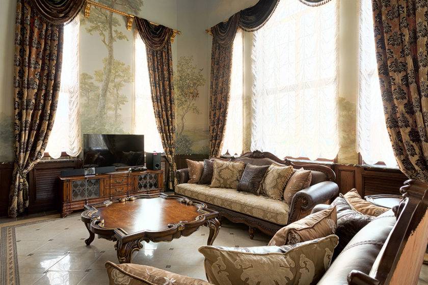Внутри помещений, предназначенных для официальных приемов, не рекомендуют допускать никаких вольностей, поэтому подхваты здесь делают строгими и однотонными.