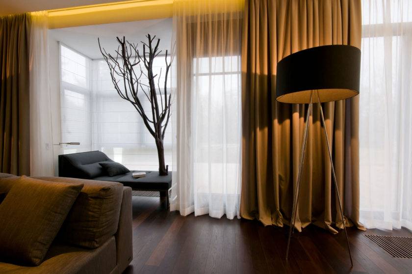 - В обычной квартире с большим окном или с оконным проемом, совмещенным с дверью на балкон, для визуального расширения пространства дизайнеры советуют вешать карниз таким образом, чтобы он закрывал стену полностью. Таким образом, мы создаем иллюзию огромного оконного проема. Шторы в пол зрительно вытягивают помещение, делая его будто бы выше.