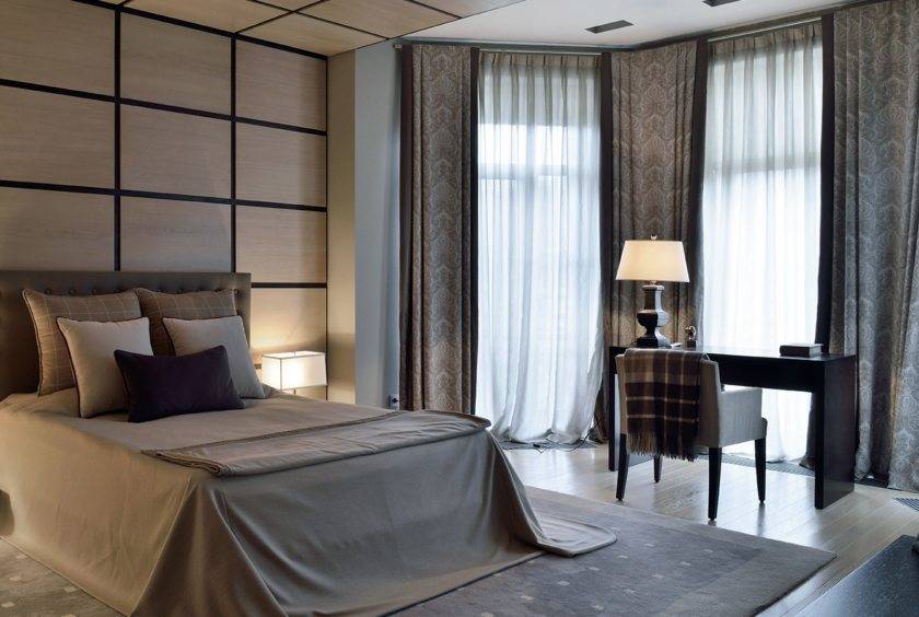 Здесь важно знать, как повесить шторы и какие ткани подойдут. В приоритете плотные однотонные модели занавесей естественных оттенков: темно-серого, коричневого, клетчатого.