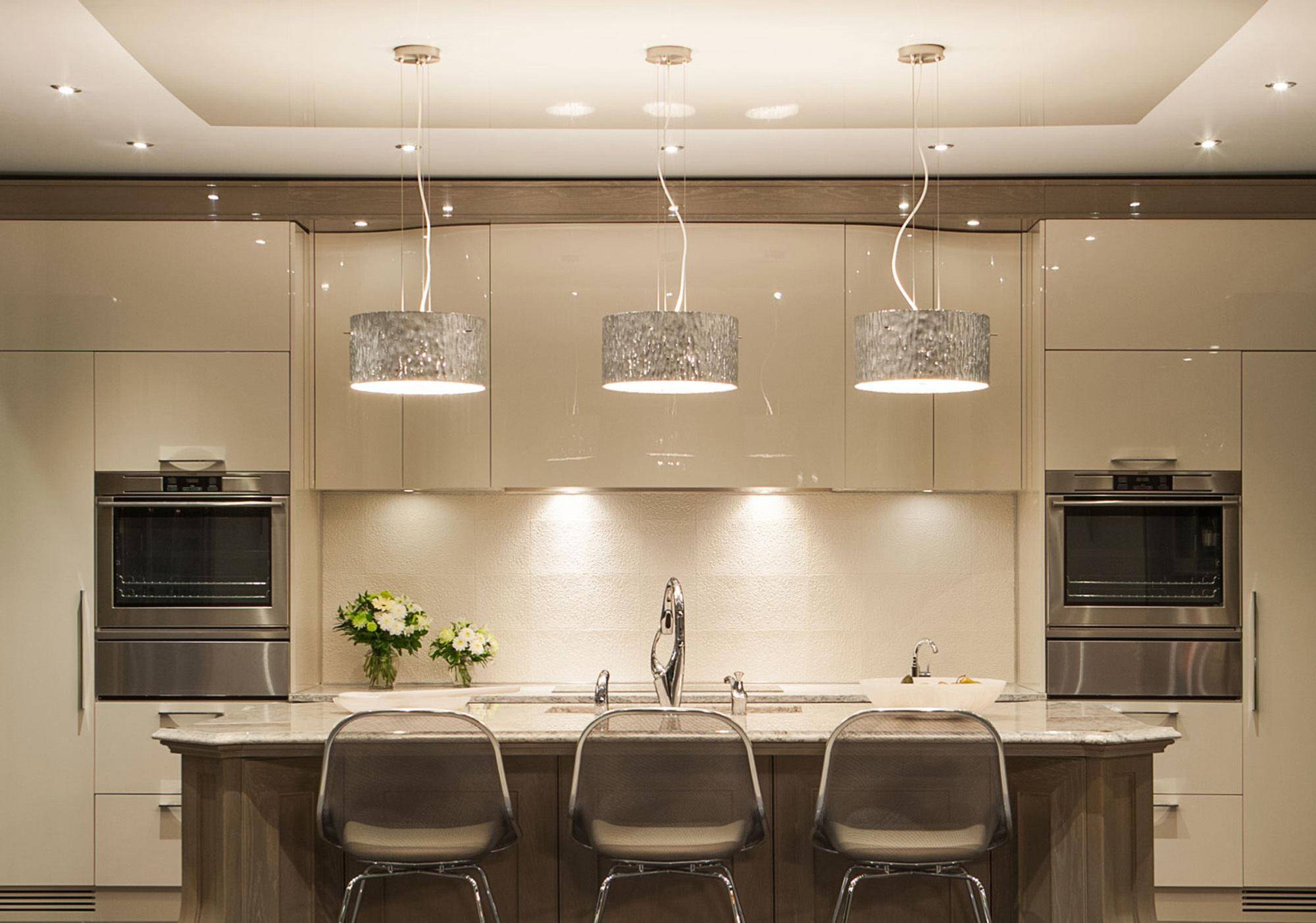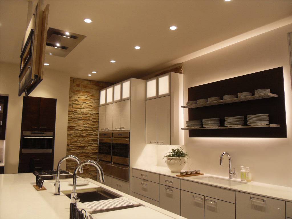 - несколько уровней освещения: потолочное, настенное, встроенное в гарнитур;