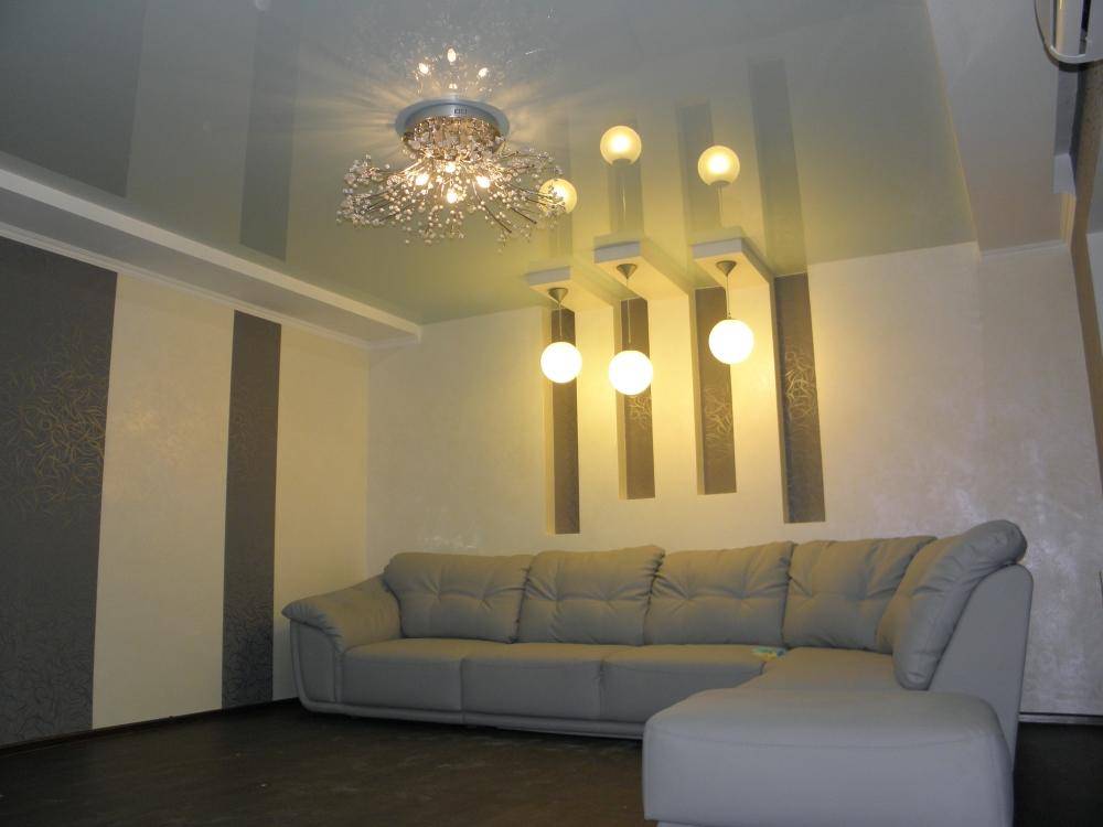 В случае же если желание и проект предполагают установку светильников, стоит задуматься о так называемых комбинированных потолках в хрущевке. По периметру в зале устанавливаются гипсокартонные конструкции, которые могут иметь различную конфигурацию, в них и монтируются светильники. Натяжное же полотно будет находиться в середине, а если при этом выбрать зеркальный вариант с соответствующей подсветкой, то потолок в хрущевке может выглядеть как бесконечное пространство, уходящее ввысь. Устанавливать светильники непосредственно в натяжное полотно, особенно в зале, нецелесообразно, это «съест» до 14 см пространства. Разве что в спальне, где высота потолка не так важна, такая «роскошь» будет уместна.