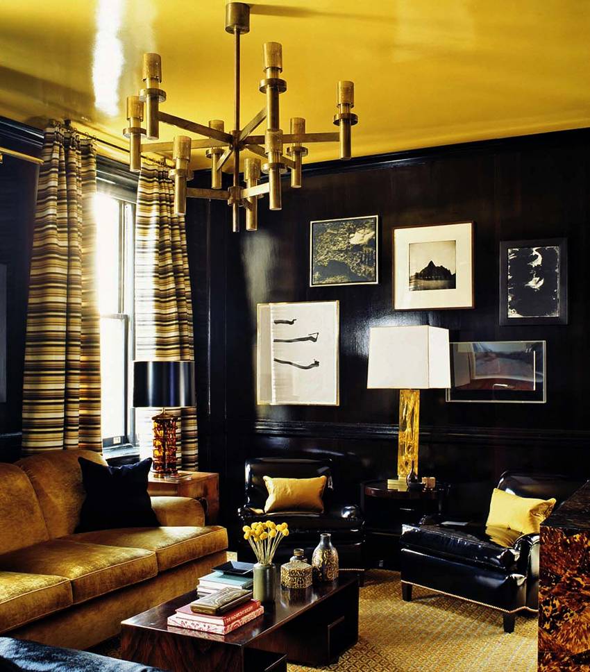 - черный натяжной потолок в зале – весьма эффектное решение. Глянцевый блеск пленочного полотна выполняет ту же функцию, что и при белом цвете, то есть обеспечивает отличное освещение и зрительно увеличивает комнату. При этом черный цвет не делает помещение мрачным, а наоборот придает ему необыкновенную элегантность. Фото черного натяжного потолка в зале могут служить примером интерьерной моды;