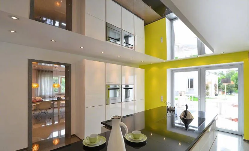 Цвет относится к холодной гамме. Подходит помещениям с окнами на южную сторону — даёт прохладу и свежесть. А кухням, выходящим на север, будет создавать слишком холодную атмосферу. Лучше ограничиться акцентными вставками в двухуровневых конструкциях, которые могут сочетаться с оттенком кухонного гарнитура.