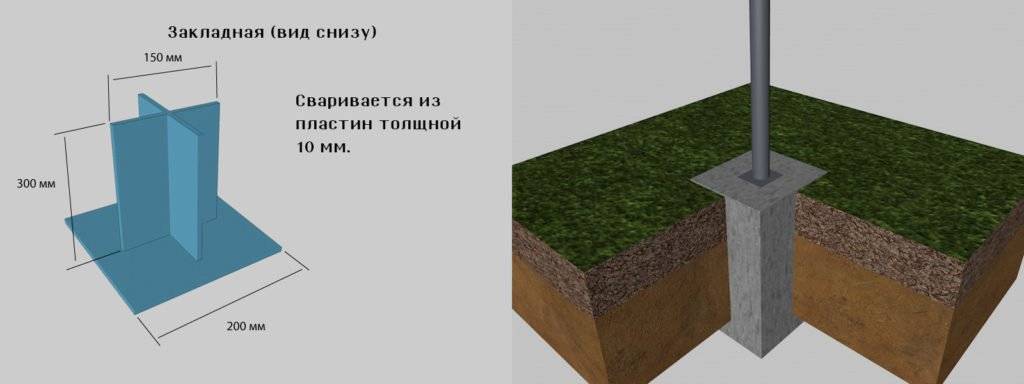 - Стальные детали квадратной формы, подходящие габаритным деталям по размеру, привариваются к нижним краям стоек. После того, как раннее залитый цементный раствор остывает, опорные столбы прикручиваются к закладным деталям.
