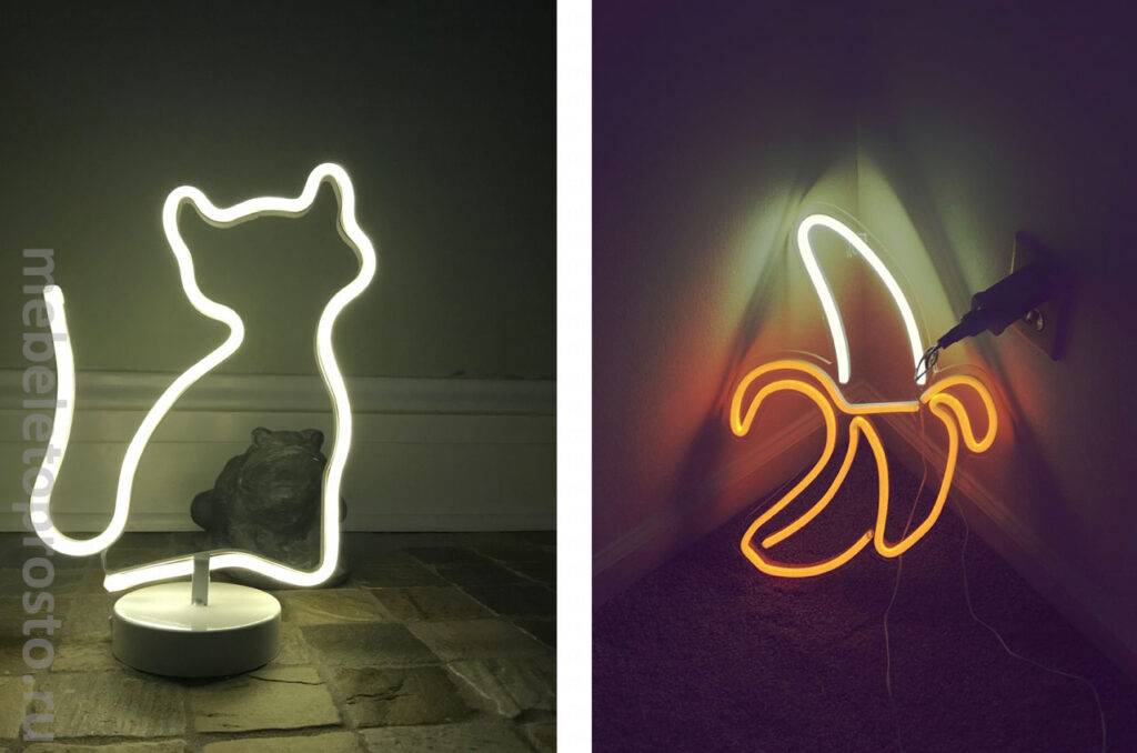Этот вариант использования неона в интерьере переживает настоящий бум. Небольшие интерьерные светильники из неоновых трубок можно встретить практически в любом помещении дома. На кухне это могут быть изображения фруктов или напитков, в спальне или гостиной – растительные и цветочные мотивы, а также необычные фигурки, тематические надписи, сердечки. Даже для детской комнаты можно выбрать интересные светящиеся фигурки из безопасного гибкого неона.