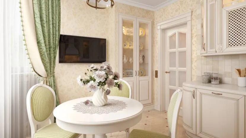 Для белой кухонной комнаты в стиле кантри или прованса, имеющую светлую мебель, моно выбрать обои светлого цвета, на поверхности которых имеется мелкий цветочек. Тогда вам удастся создать уютную атмосферу. Не рекомендуется использовать темный цвет и очень крупные элементы.