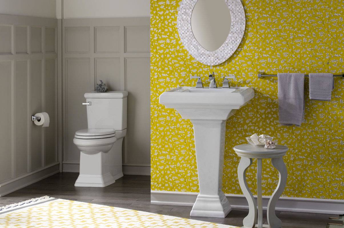 Классический стиль всегда актуален в оформлении ванной. Классика – это сдержанность, практичность и элегантность в одном флаконе. Обои белого цвета, пастельные оттенки помогут создать подобающий интерьер. Желательно подобрать полотна с узорами или рисунками среднего размера.