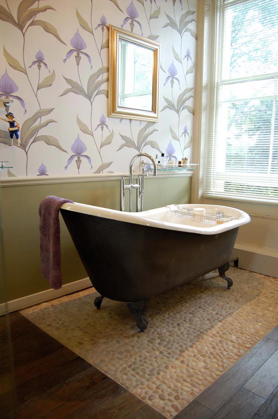 Интерьером необычной ванной комнаты на следующей фотографии занимались дизайнеры компании Rico’s General Construction, которые использовали для оформления стен комнаты небольшой квартиры узорчатые черно-белые обои.