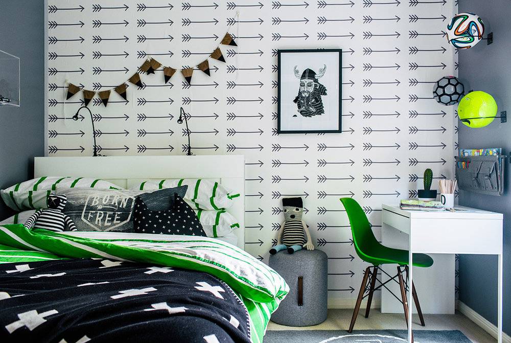Долю динамики и харизмы внесут изображения на обоях, присутствующие в виде надписей, узоров или имитирующие природные материалы.