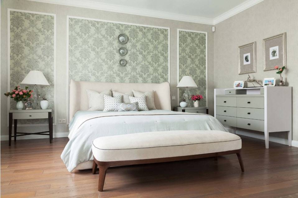 На фото спальня в стиле неоклассика. Отделка стен выполнена обоями-компаньонами горизонтальным способом.