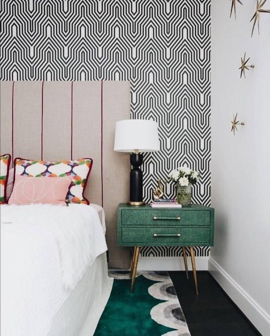 Комбинированные обои в спальне 2021 года преобладают в черном цвете. Именно он помогает создать роскошную обстановку. Получить изломанные узоры с помощью окраски — трудоемкий процесс, поэтому здесь пригодятся обои.