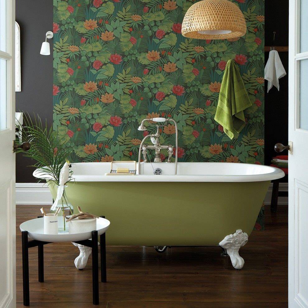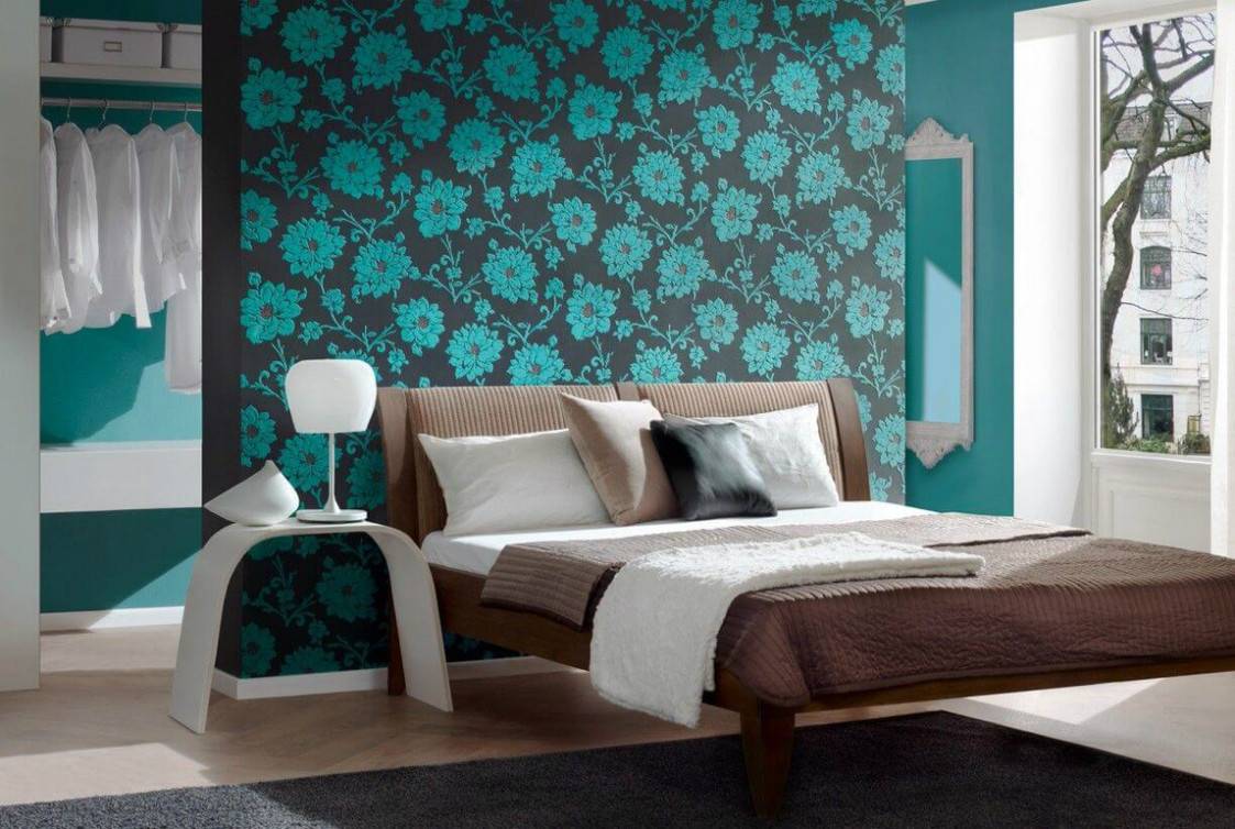 Зеленый цвет полотен можно дополнить с помощью белых, голубых, коричневых покрытий. Хорошо будут выглядеть в дизайне разные древесные оттенки. Бирюзовые обои сочетается с оливковыми, серыми и черными.