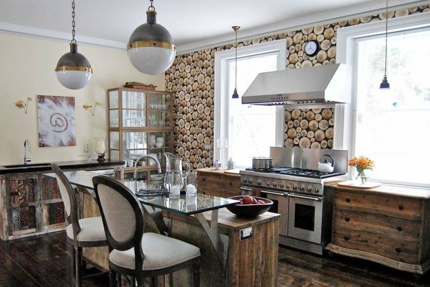 Удачный пример использования 3D обоев с имитацией сруба дерева на кухне
