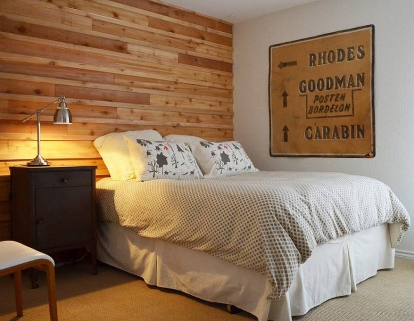 Поскольку спальня обычно небольшого размера, то для того, чтобы создать уютную и спокойную атмосферу, следует отделывать стены покрытием с изображением светлой древесины. Если есть желание использовать фотообои, то наносить их рекомендуется на небольшой участок стены, иначе изображение “заберет” много пространства.