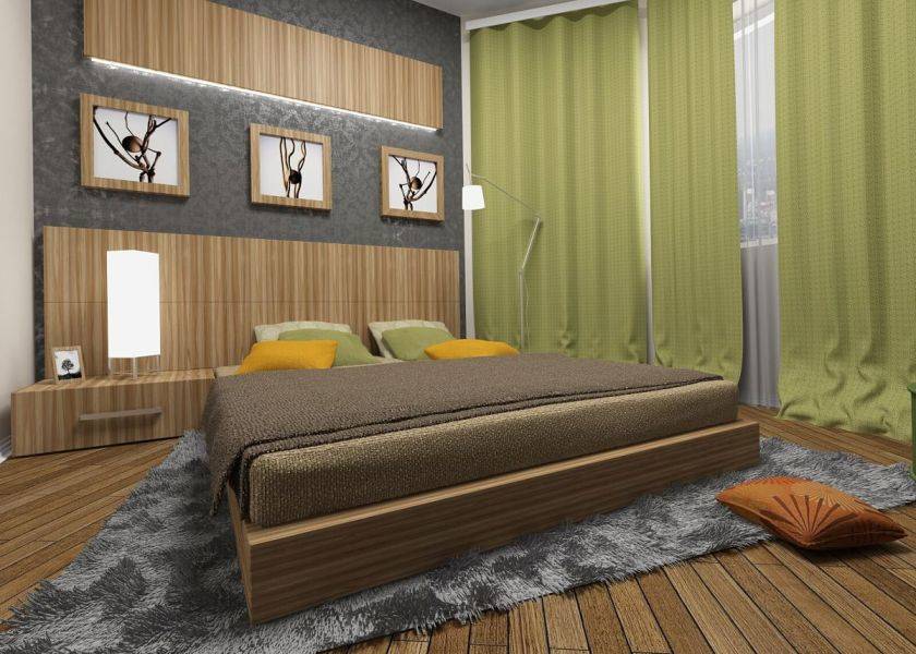Можно создать за счет отделки стен ламинатом или панелями, а также зелеными обоями в разных пропорциях. Древесную отделку пола лучше выбирать светлых оттенков. Зеленые обои можно дополнять такими же подушками, пледом, ковром, подстилкой, рамками, горшочками для цветов и статуэтками.