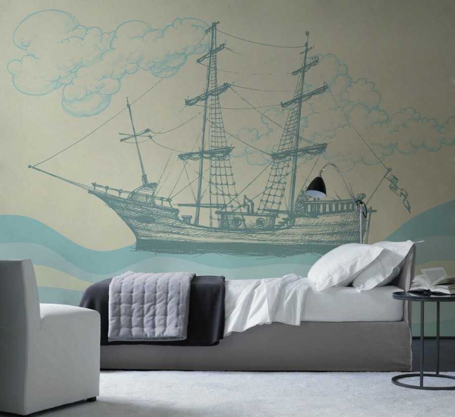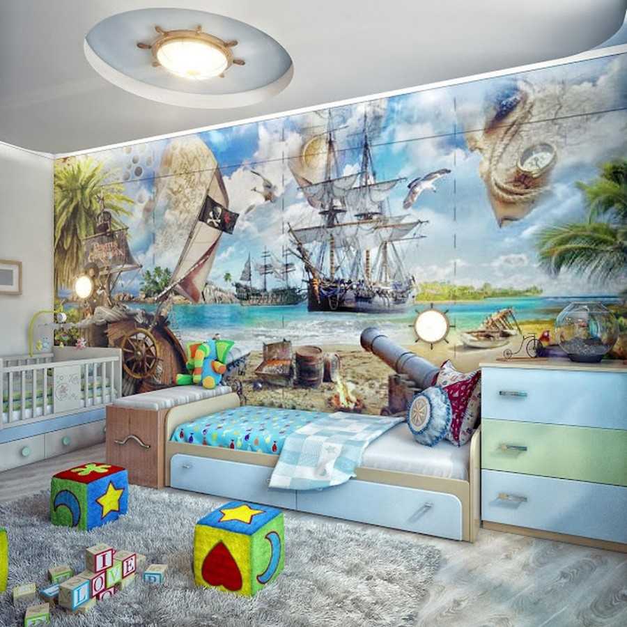 Пираты — очень популярная тема у мальчиков, поэтому обои с рисунками на тему моря и кораблей отлично подойдут для детской. Пиратские фотообои можно дополнить декором, например, ящиками для игрушек в виде старинного сундука с сокровищами, настоящим штурвалом, игрушечным оружием и пр.