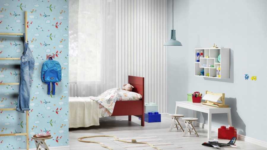Отличный пример универсального интерьера: такой баланс между расцветкой обоев и мебели делает эту комнату пригодной для проживания детей обоих полов и любого возраста, начиная с 12 лет. Будучи, с одной стороны, весьма заметным штрихом в дизайне, эти обои, с другой стороны, являются абсолютно нейтральным фоном: можно сменить мебель и элементы декора, а баланс все так же будет соблюден.