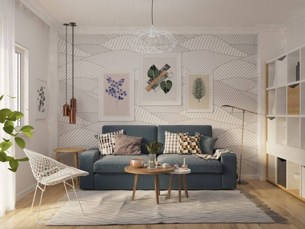 Чтобы минимизировать расходы и в то же время наслаждаться очень прочным покрытием стен, стоит поклеить обои на 1 стену в гостиной. Это новая тенденция, благодаря которой интерьер не перегружается, декор становится динамичным, а в расстановке не остается места для других сильных декоративных акцентов.