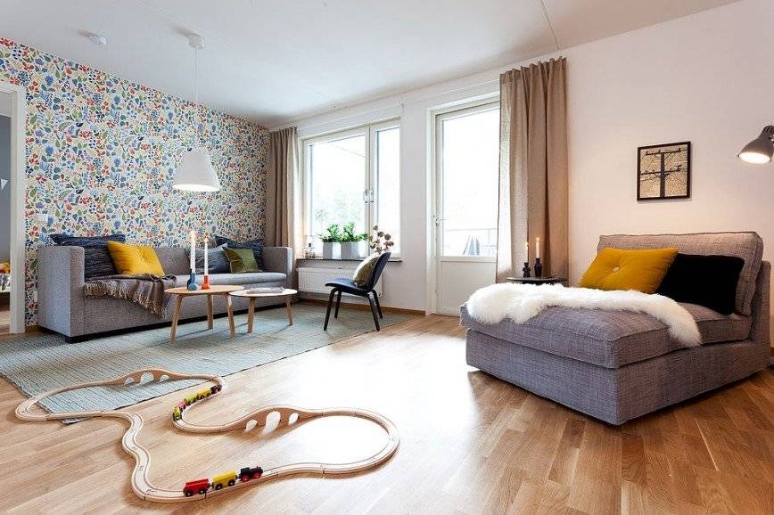 Выделения стен. Площадь, на которой делается акцент, оклеивается полотном дополняющего цвета. Такой дизайн визуально выравнивает форму гостиной, маскирует имеющиеся недостатки квартир стандартной планировки. Этот прием рекомендуют для небольшого или прямоугольного зала.