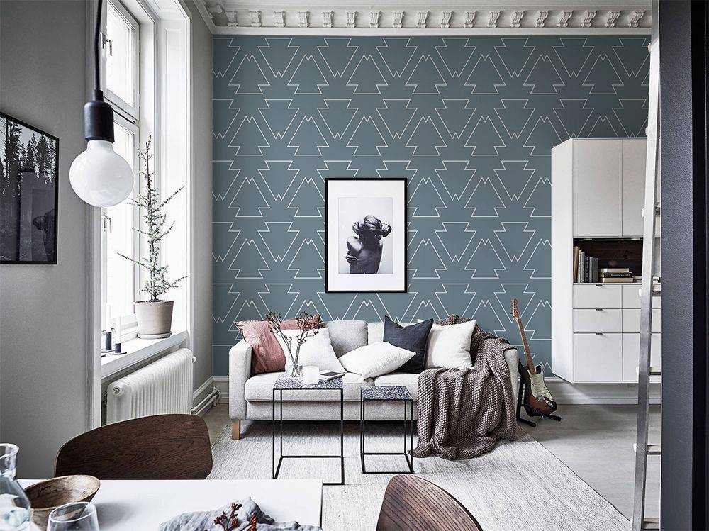Сочетайте акценты темно-серого цвета со светлой мебелью для создания современного эффекта! Геометрический узор на обоях смотрится эффектно. Акценты в виде аксессуаров также важны в серой гостиной – серые подушки или элегантный пуф еще больше подчеркнут атмосферу всего интерьера.
