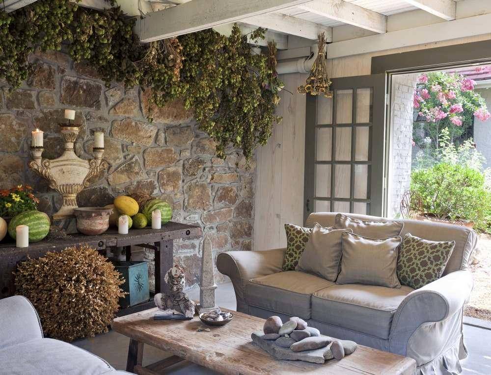 - Светлая отделка всех внутренних поверхностей. Грубоватая, «деревенская» штукатурка, обои в наивный цветочек, кладка из грубо отесанного камня, древесина естественных тонов с хорошо заметной текстурой. Допускаются небольшие элементы из кованого металла, резные деревянные фрагменты.