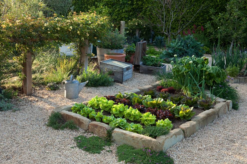 Высокие грядки со шпалерами на участке, засыпанном гравием
