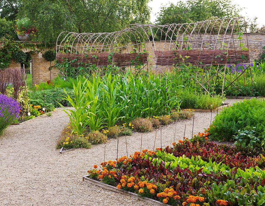 Современный огород представляет собой компромисс между классическим огородом с овощными традиционно устроенными грядками и цветочными посадками, украшающими участок.