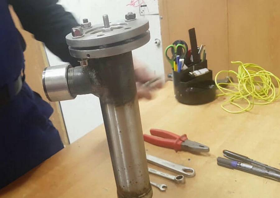 В качестве корпуса для электрического котла отопления своими руками используем трубу с внутренним сечением около 50 мм и длиной в 40 см. Кроме того, понадобится цельный стержень диаметром 20 мм и длиной 30 см, а также два переходника с нарезанной внутренней резьбой. В торце стержня высверливаем глухое отверстие с резьбой под болт Ø10 мм.