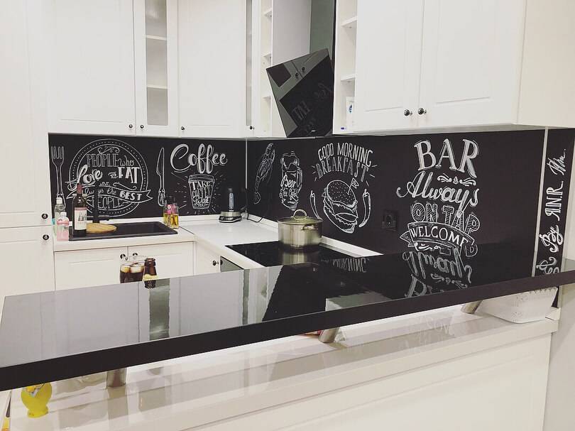 Очень оригинальный метод — вместо фартука сделать грифельную доску. Все, что для этого нужно, — это трижды пройтись грифельной краской по необходимому пространству. За ним легко ухаживать — избегайте использования абразивных чистящих средств и жестких губок.