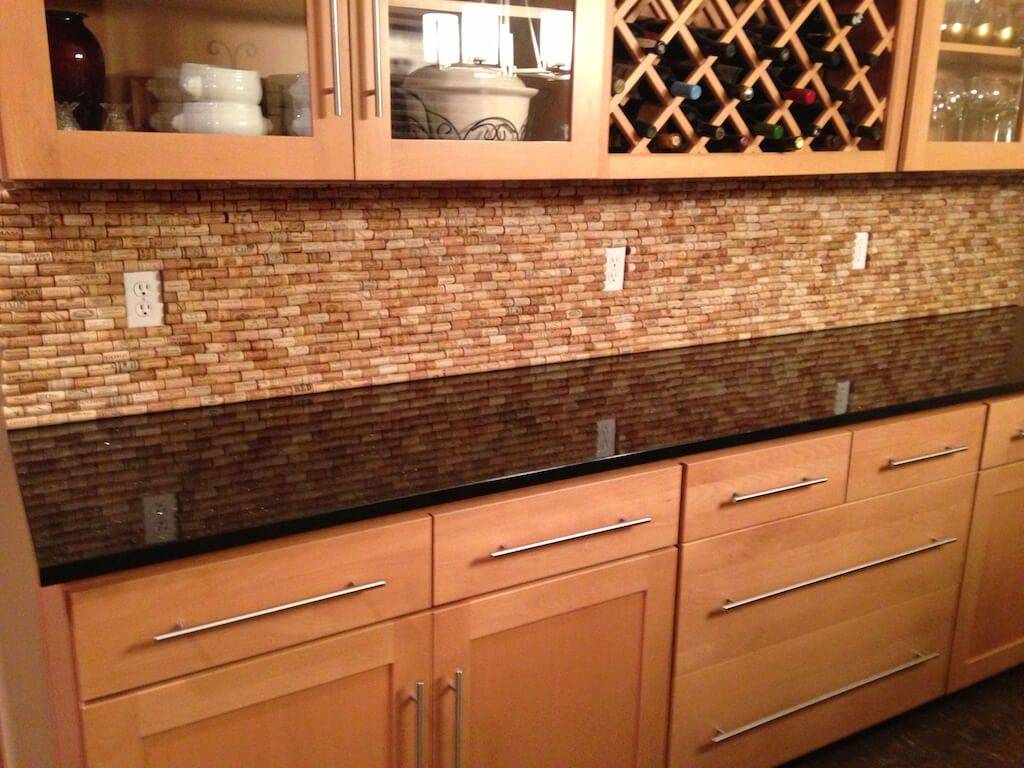 Схема укладки такая же, как и у паркета. Пористый только материал колпачков, поэтому мыть их будет большой проблемой. Можно прибегнуть к постоянному помощнику — стеклу, но стоит ли строить фартук уже толстым? Идея винной пробки подойдет для обеденной зоны, но для рабочей зоны на кухне.
