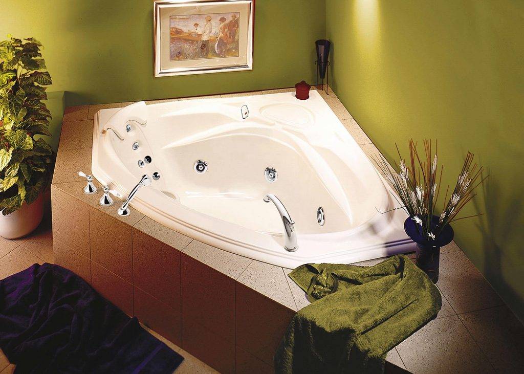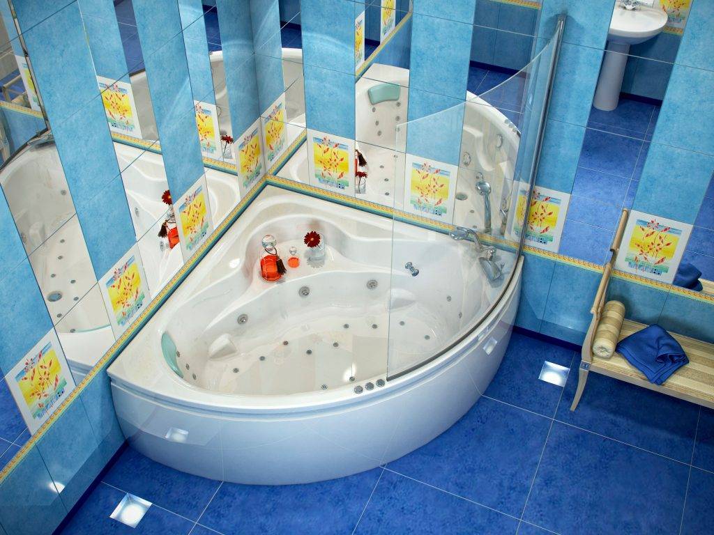Такой вид ванной можно «утопить» в полу. При этом применяют технику многоуровневого пола. Чтобы лучше понять, как смотрятся угловые ванны в интерьере, фото представлено ниже.