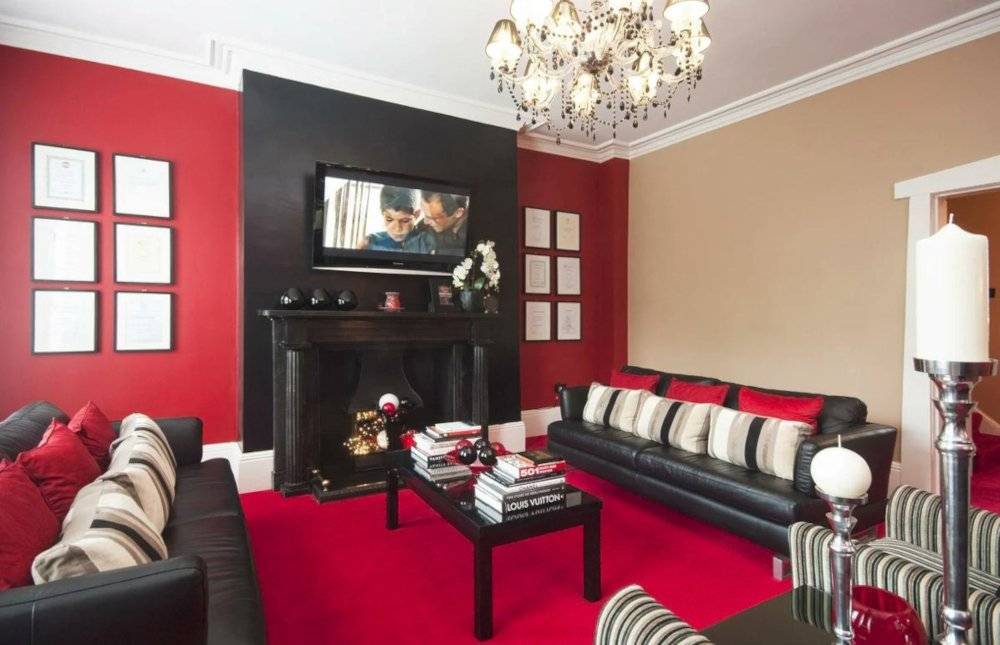 Если в красных оттенках оформляется гостиная или зал, то в сочетание могут вступать оттенки черного, коричневого и желтого. При черной мебели лучше не создавать мрачной обстановки черным цветом, стоит внести бежевые и другие светлые оттенки коричневого в комнату. Гардины на окнах могут перекликаться в цветовой гамме с текстилем на мягкой мебели или ковровом покрытии.