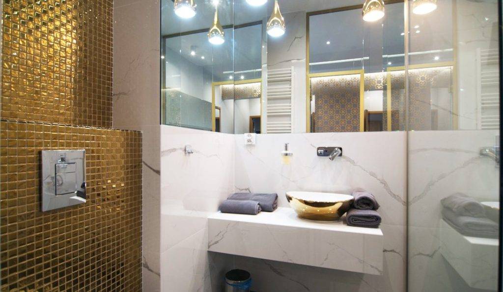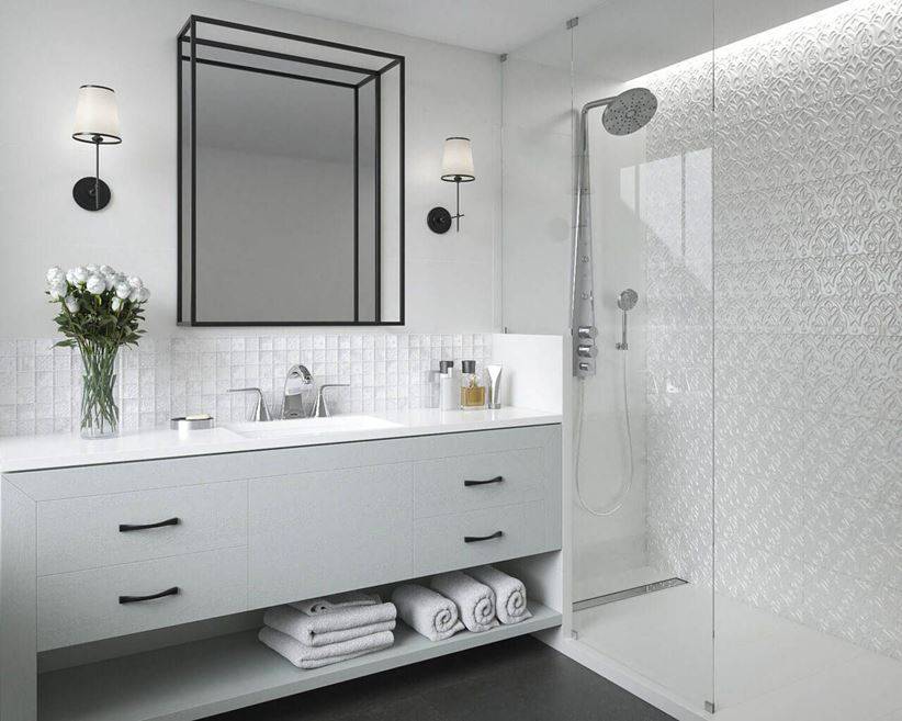 Вы можете использовать гранитную плитку, которая отлично впишется в декор. Вы можете дать нотку утонченности, выбрав золотые акценты или цветные акценты, которые раскрывают утонченность. Красная и белая плитка создают идеальную обстановку для такого типа расположения, наряду с белой и современной сантехникой, которая придаст пространству приятный интерьер. Все должно быть продумано как можно проще, в виде прямых линий и четко определенных форм.