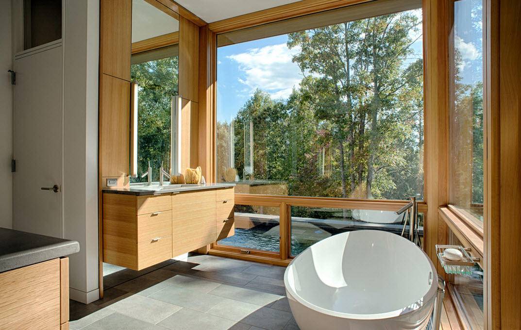 Ванная с окном такого типа — удачное решение для квартир, расположенных на высоких этажах, или частных домов с видом на водоем или сад. Большая обзорность, наилучшее дневное освещение, элегантный интерьер — все это даст панорамное окно в ванной комнате.